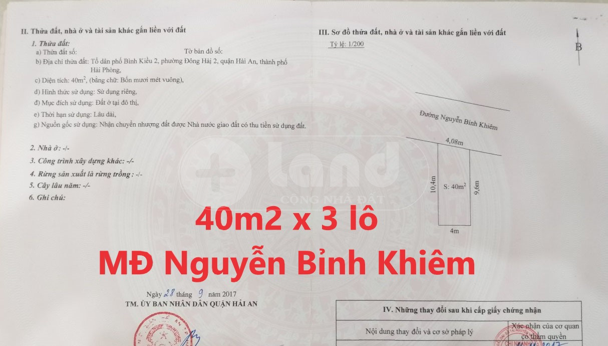 Chuyển nhượng 3 lô đất mặt đường Nguyễn Bỉnh Khiêm, Đông Hải 2, Hải An, Hải Phòng.