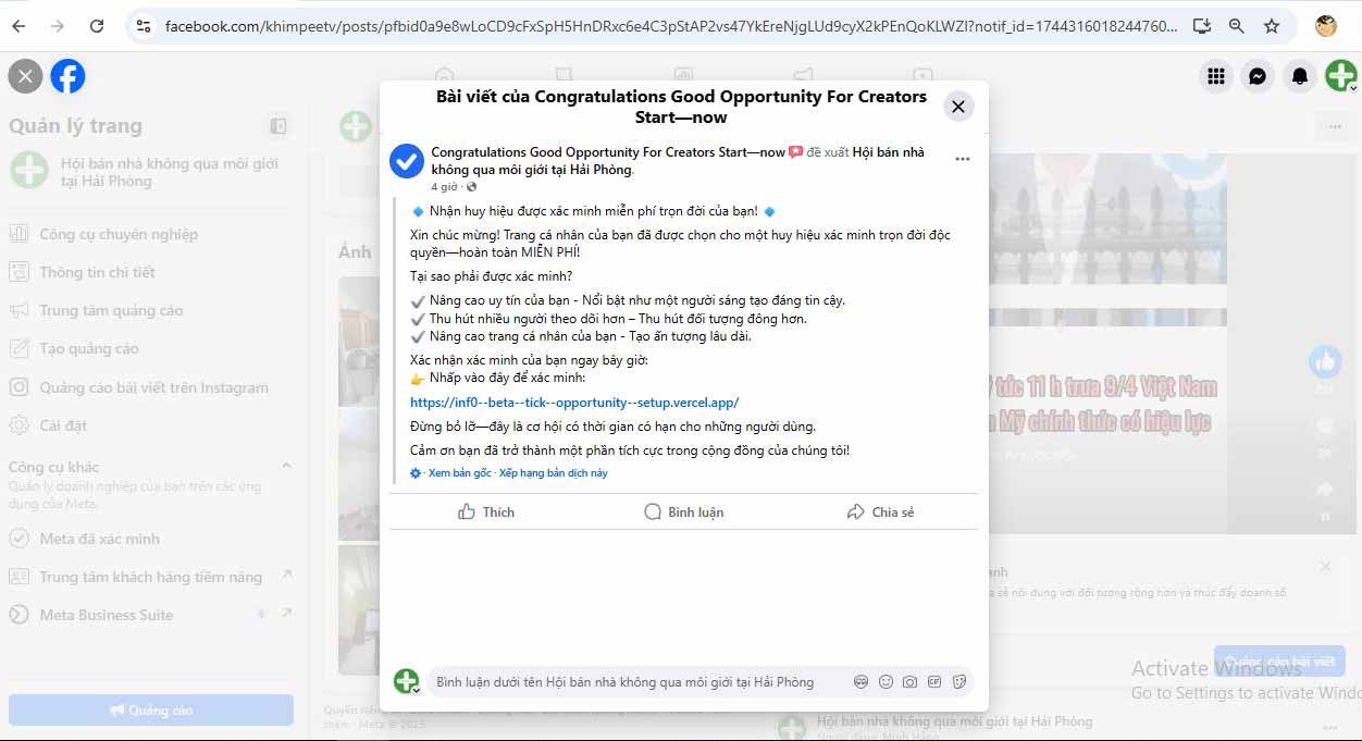 Đặc biệt, ngày 11/ 4/ 2025 Facebook đã gửi đến Đề xuất nhận tích xanh độc quyền trọn đời cho Fanpage Hội bán nhà không qua môi giới tại Hải Phòng với 34k người theo dõi ( hoàn toàn miễn phí ) . Đây là một sự ghi nhận cho những hoạt động tích cực tròn 7 năm kể từ khi thành lập Page vào ngày 11/ 4/ 2018... Hành trình đều đặn với mỗi ngày 2 - 3 bài viết cùng với lượng video được chính tay chúng tôi Edit. Tính sơ sơ cho đến thời điểm hiện tại Page đã đăng hơn 7.500 bài viết cùng với hơn 500 video đủ các chủng loại từ tin tức, mua bán nhà, cho đến dự án...